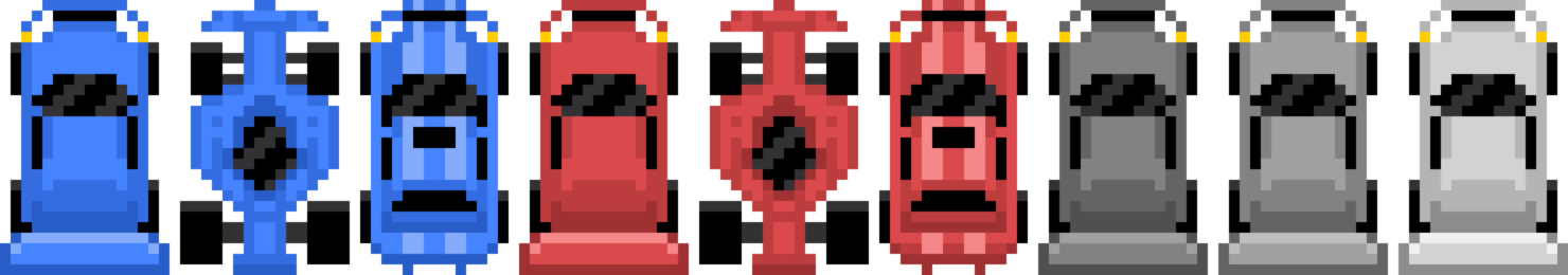 I also drew 3 different "skins" for the cars, which can be changed in the startup menu. During the game, to make the effect that the cars are moving while they stay in the same position, the dashed lines on the road, the coins, the obstacle cars all move down from the top. I used the random() function to generate coins and obstacles cars at random time intervals, while placing some restrictions to ensure they will not be too close to one another. Here are the assets I made and used for the game.