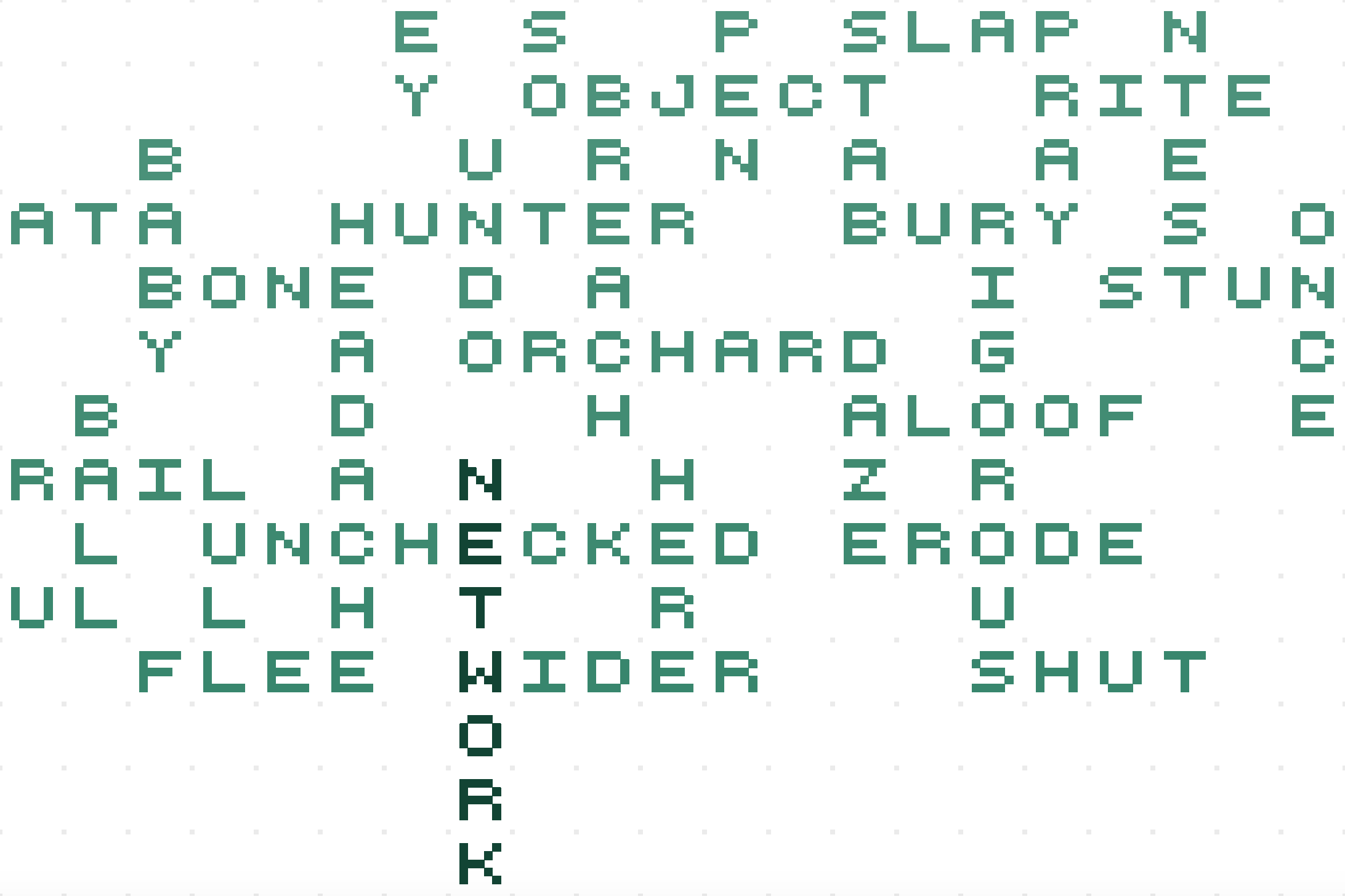 Then I coded the basic mechanics of the plant experience. Similar to my last project, I used the canvas element for efficient pixel-perfect rendering. The canvas is divided into square tiles where each tile can be a letter. Similar the mechanics of a crossword puzzle, users can create new branches from a shared letter on an existing branch. I added some limitations such as two branches cannot be adjacent so that the overall visual better resembles a plant.