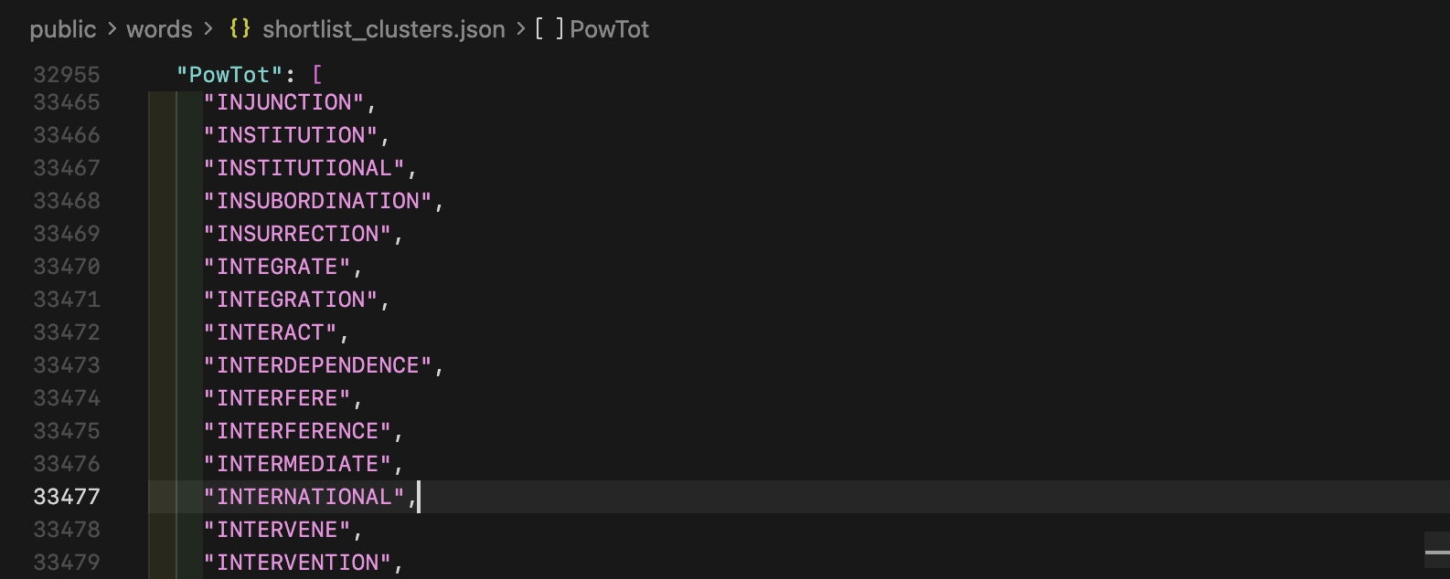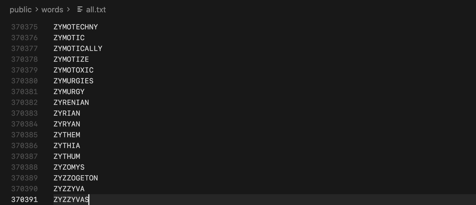 Next I needed to implement the word validation. I thought of using server-side APIs, but eventually decided to use a comprehensive word list txt file (370,000+ words) that the frontend would fetch and use in the background. This way, after the file is fetched, all word validation could be instant.