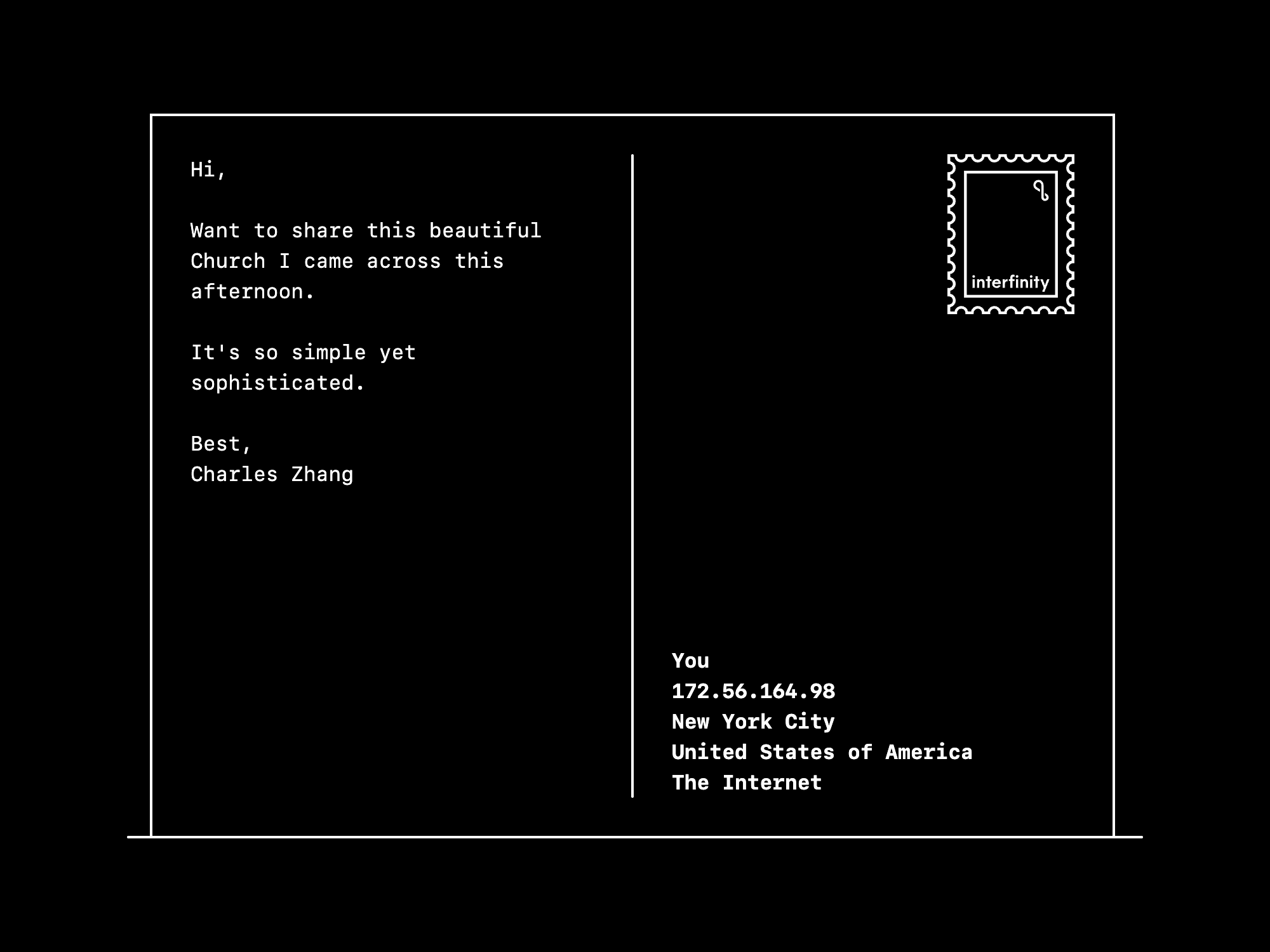 There's a total of 5 envelopes, leading to 3 letters and 2 postcards, each about a day on my trip. For the letters, I created a layout similar to a physical letter—with the sender and recipient addresses (in this case IP addresses) on the top and the content below them. For the postcard, I created a flip-over hover animation using CSS, recreating the feel of flipping over a physical postcard and seeing the message on it.